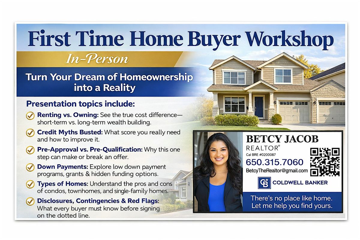#FirstTimeHomeBuyer #BayAreaRealEstate #FreeClasses #HomeBuyerSeminar #BuyaHome #BayAreaRealtor #BetcyTheRealtor