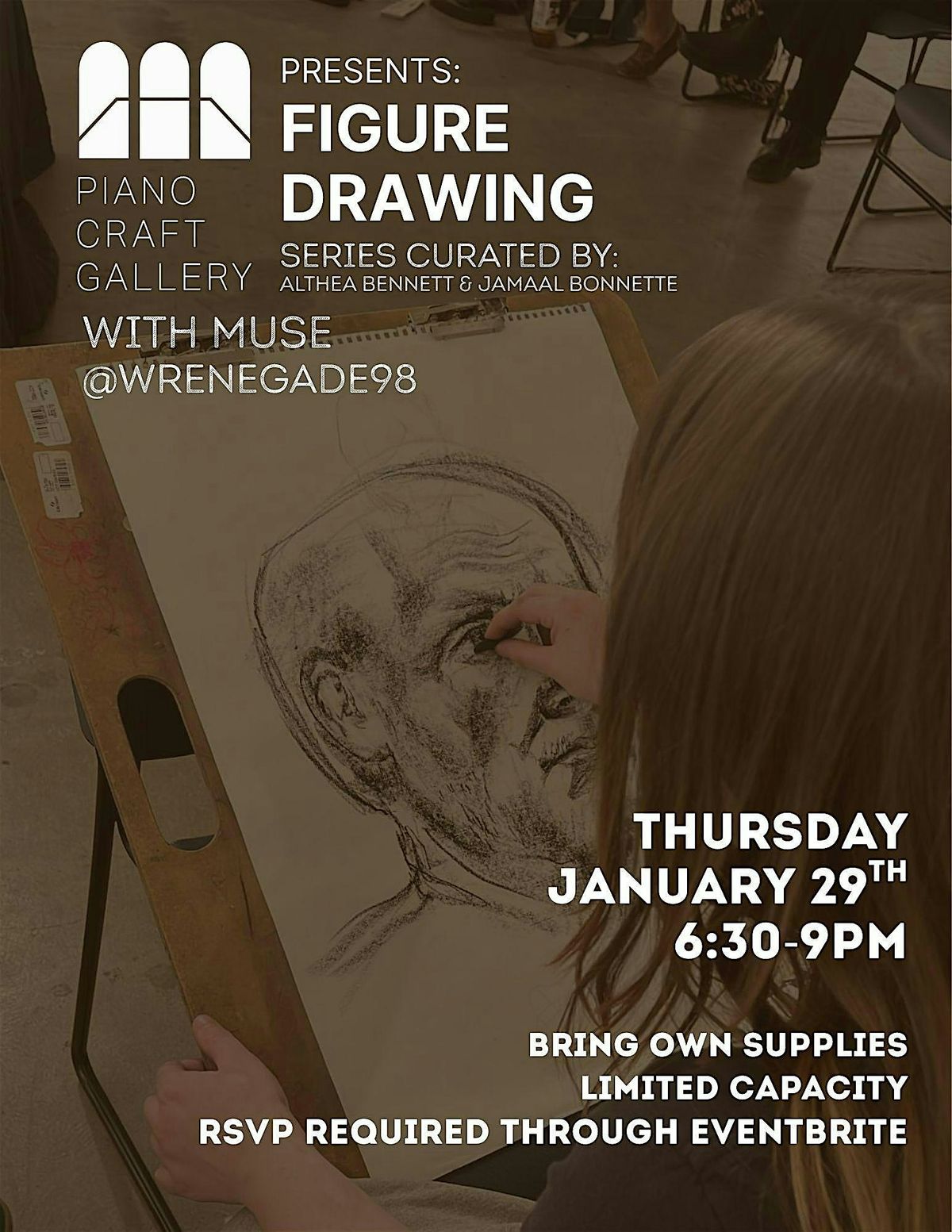 Live Figure Drawing is back at The Piano Craft Gallery! Develop your figure drawing skills with artists and directors Althea B Bennet & Jamaal Bonnette! Participants will practice figure drawing with a live model through gesture sketches and longer-duration observation. This in-person event is perfect for artists of all levels looking to practice their drawing skills. Grab your sketchbook and pencils and get ready to capture the beauty of the human form. Whether you're a seasoned artist or just starting out, this event is a great opportunity to hone your craft. All skill levels are welcome. Participants are asked to provide their own media supplies.