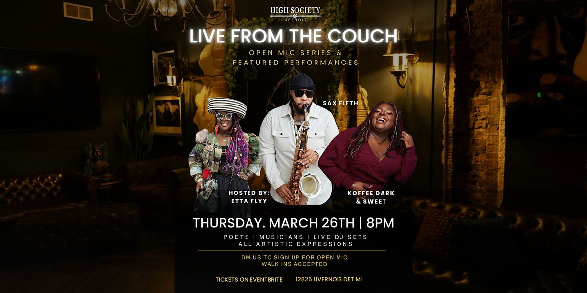 Join us for another soulful night of Live From the Couch at High Society Detroit on March 26. This intimate experience blends live music, poetry, and open mic performances in an elevated lounge setting designed for creatives and music lovers.