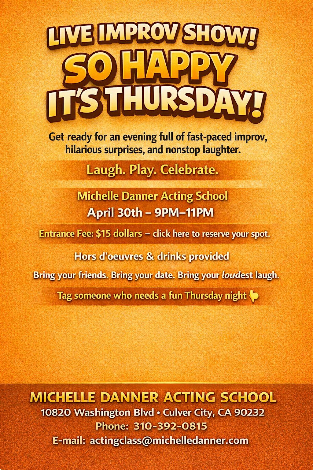 ”A Night of Unscripted Comedy, Big Characters & Unexpected Moments!Get ready for an evening full of fast-paced improv, hilarious surprises, and nonstop laughter.Laugh. Play. Celebrate.Michelle Danner Acting School