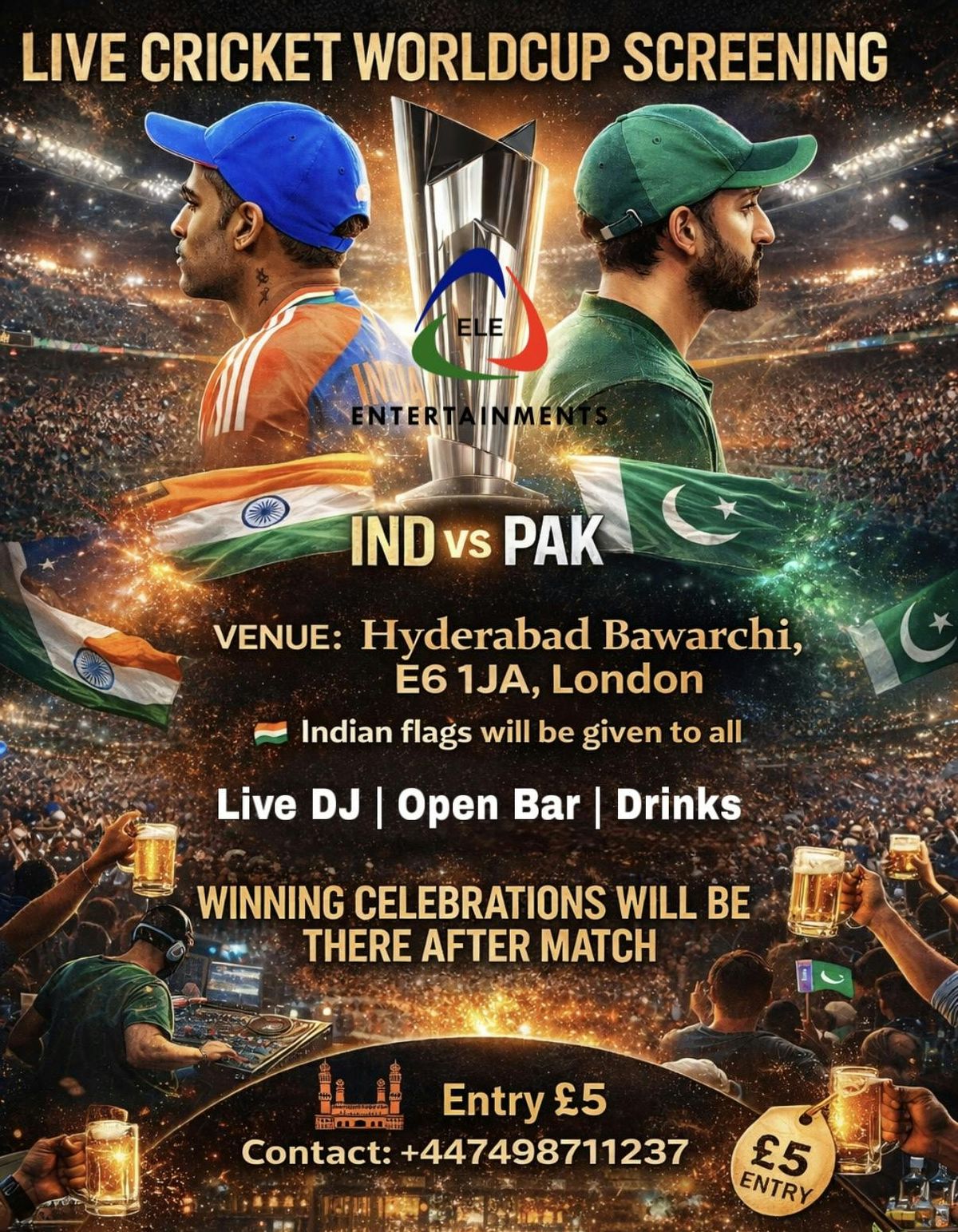 ✨ What’s waiting for you?🎉 Live match screening🎧 Live DJ🍻 Open Bar🍽️ Delicious Food🏳️ Indian flags for everyone🎊 Winning celebrations after the match