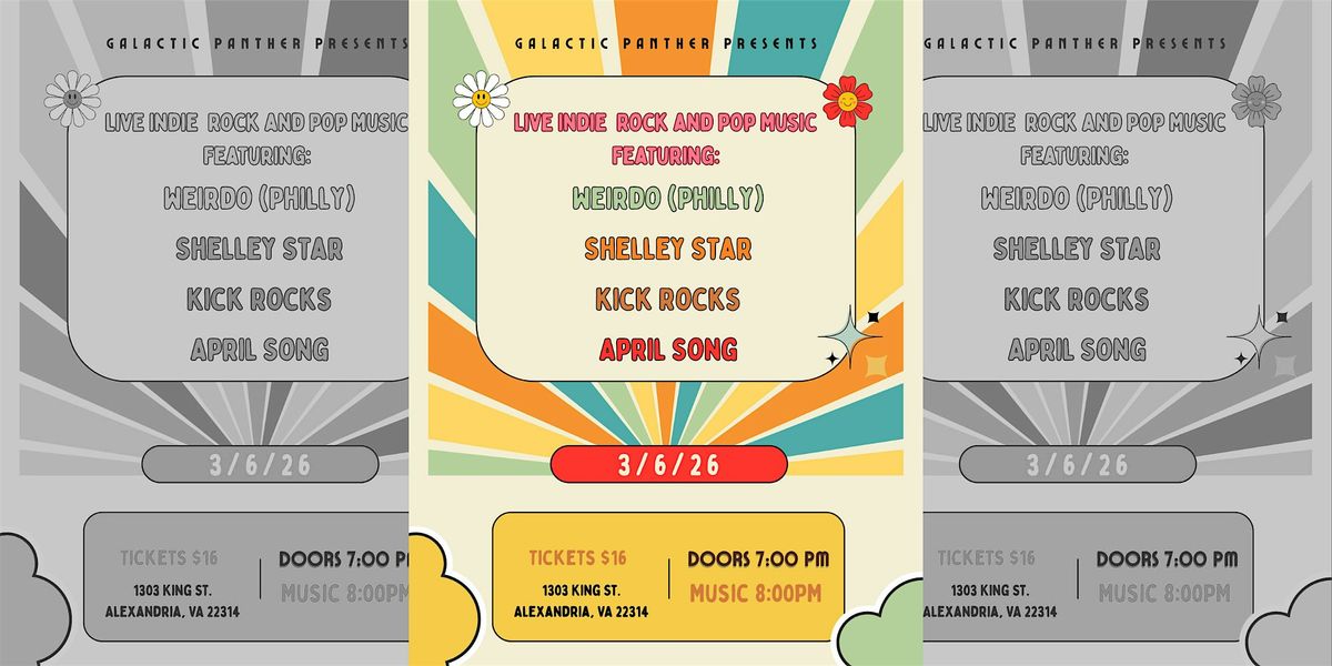 Welcome to the LIVE MUSIC: Live Indie Rock and Pop Music Night with Weirdo, Kick Rocks, April Song, and Shelley Star at Galactic Panther Art Gallery! Get ready to groove to amazing tunes on March 6, 2026 at 8:00 PM (Eastern Time). Join us for a night filled with electrifying performances by talented indie rock and pop artists. Let the music transport you to another world as you enjoy the vibrant atmosphere of the gallery. Don't miss out on this unforgettable experience!