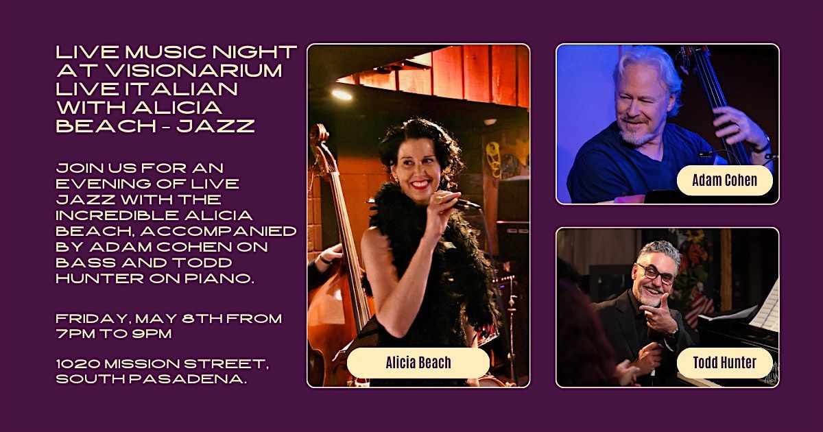 Join us Friday, May 8th from 7PM to 9PM in the heart of South Pasadena for an unforgettable evening of live jazz with the incredible Alicia Beach, accompanied by Adam Cohen on bass and Todd Hunter on piano.