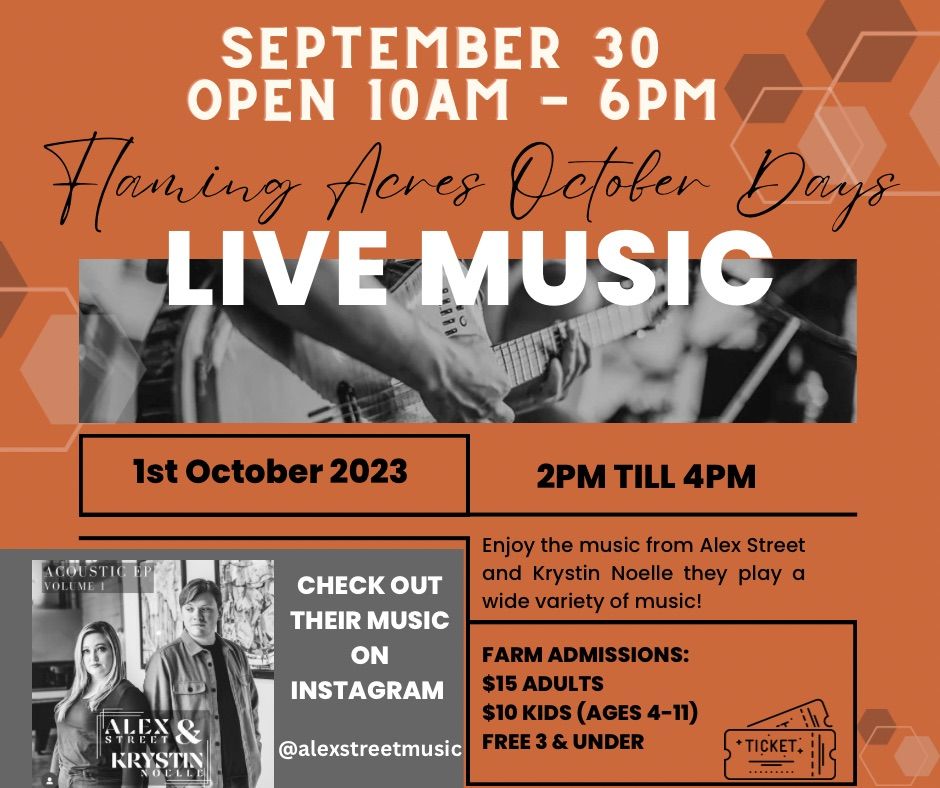 Enjoy the music from Alex Street and Krystin Noelle they play a wide variety of music! Admission includes the live music!