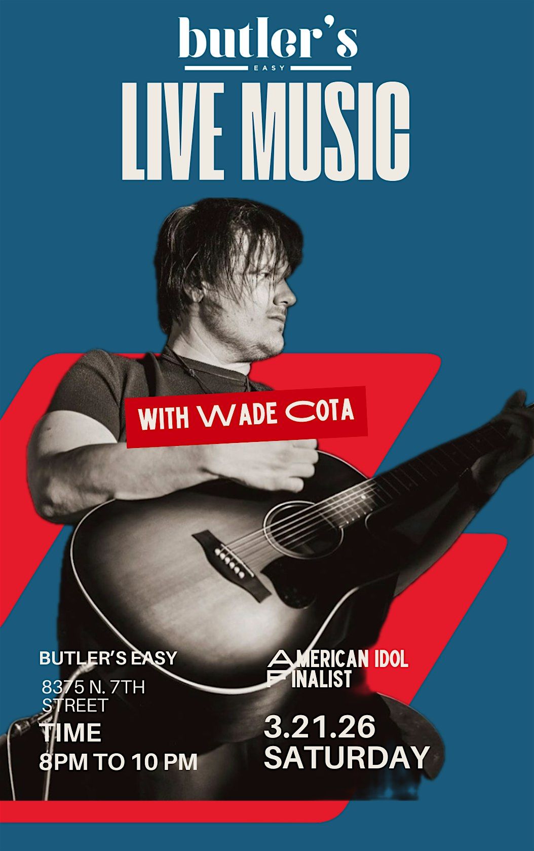 Join us at Butler's Easy on March 21, 2026 at 8:00 PM (MST) for an unforgettable night! Wade Cota, the talented American Idol finalist, will be rocking the stage with live tunes. It’s the perfect chance to kick back, enjoy great vibes, and experience some amazing music in person. Grab a cocktail and make a song request. Don’t miss out on this fun evening with an awesome live performance! Trust us, you don't want to miss this.
