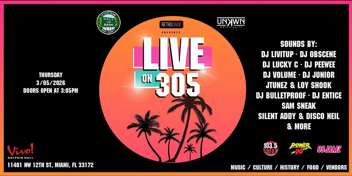LIVE ON 305 is a multicultural community gathering created by Retro Dade in partnership with Only in Dade and Unkwn Hospitality. Expect live DJs, local vendors, food, pop-ups, and special guests celebrating real Miami culture.