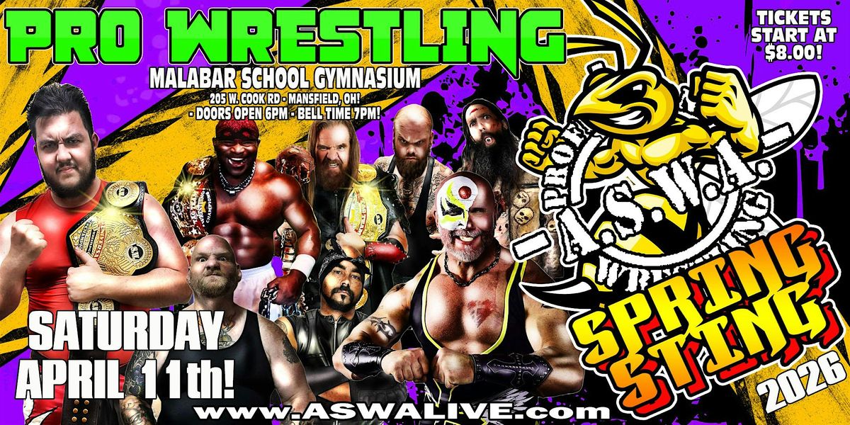Welcome wrestling fans! Get ready for an action-packed night at ASWA Spring Sting 2026! Join us at the MALABAR SCHOOL GYMNASIUM on April 11, 2026 at 7:00 PM for an unforgettable experience. Cheer on your favorite wrestlers as they battle it out in the ring! Don't miss this epic showdown - mark your calendars now!