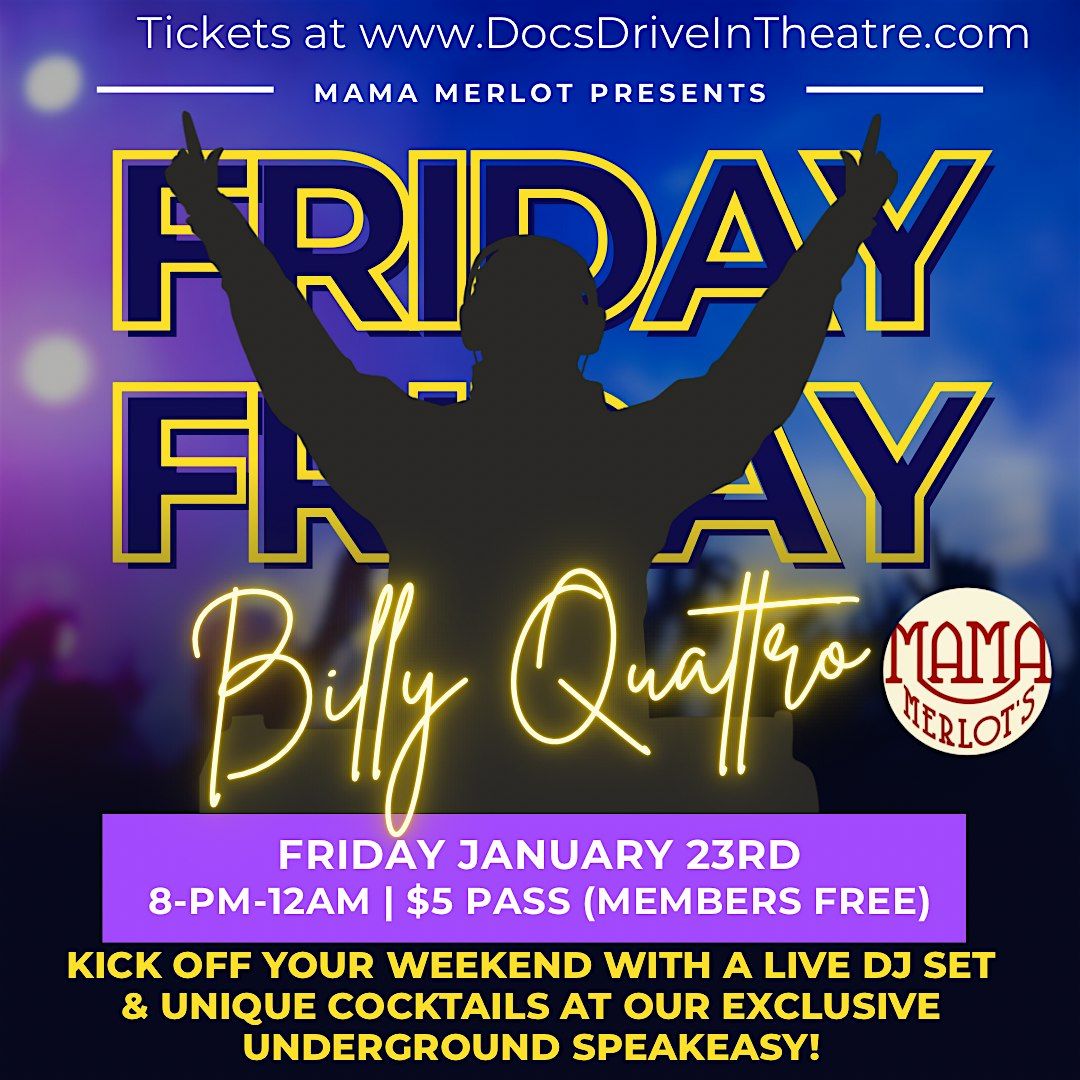 Get ready to groove to the beats of LIVE VINYL DJ with Billy Quattro at the Mama Merlot's Speakeasy! Join us on January 23, 2026 at 8:00 PM-Midnight for a night of music and fun spinnig with vinyl at the speakeasy. Let's dance the night away to some classic tunes spun by the talented DJ Billy Quattro. Don't miss out on this exciting event! See you there!