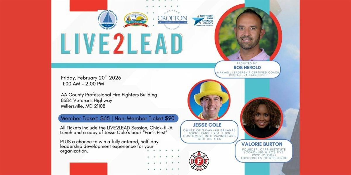 Experience a high-impact leadership event designed to inspire, challenge, and equip today’s leaders. LIVE2LEAD brings you exclusive video training from ’s renowned live event, paired with thought-provoking, facilitated discussions alongside fellow Chamber members from the Greater Crofton Chamber of Commerce, Severna Park Chamber of Commerce, Southern Anne Arundel Chamber, and Northern Anne Arundel Chamber.