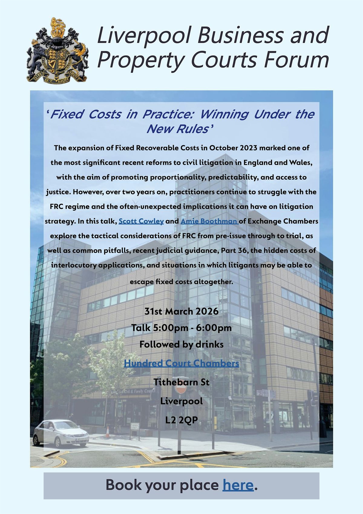 Liverpool BPC would like to invite you to join them on Tuesday 31st March at Hundred Court Chambers, Liverpool. The event will be chared by HHJ Cadwallader and the talk by Amie Boothman and Scott Cowley, from 17:00 - 18:00, will be followed by drinks.