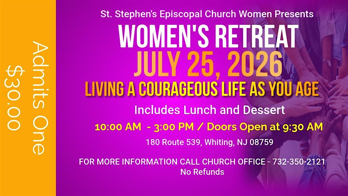 Join us on July 25, 2026 at 10:00 AM (Eastern Daylight Time) for a soul-refreshing day at St. Stephen's Episcopal Church of Whiting, NJ. This retreat is all about embracing courage and confidence as you grow older. Connect with amazing women, share stories, and find inspiration to live your best life. It's a relaxed, welcoming space just for you—come as you are and leave feeling empowered!
