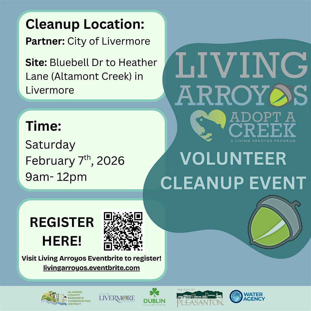 Join us on Saturday, February 7th, 2026 from 9am-12pm for a Living Arroyos Cleanup Event. Living Arroyos will be hosting a trash cleanup day along the Altamont Creek, from Bluebell Drive to Heather Lane in Livermore! Come help clean up along our local creeks and streams!