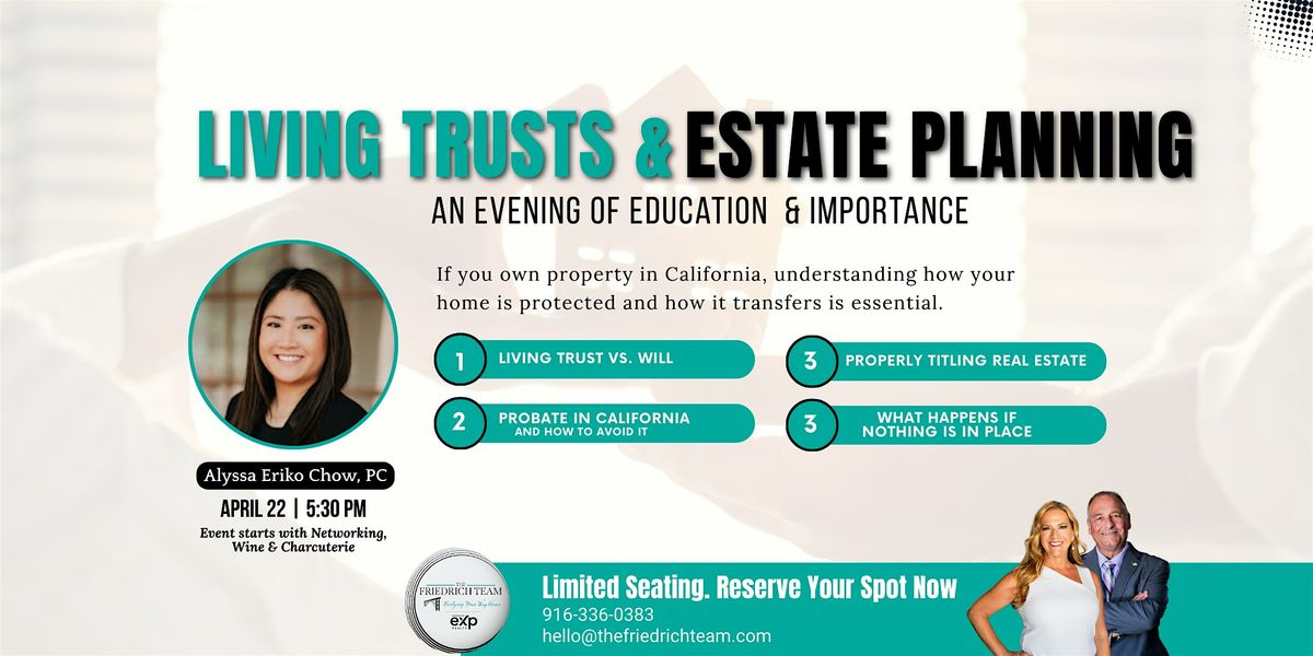 Don’t wait. April 22 Living Trust education night. Limited seating. 5:30 networking, 6PM presentation. RSVP ASAP.