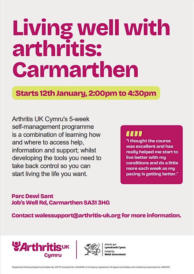Mae ein cwrs 5-wythnos AM DDIM ar gyfer unrhyw un sydd ag arthritis neu gyflwr cyhyrysgerbydol cysylltiedig yn ardal Caerfyrddin. Fe'i cynlluniwyd i helpu i'ch cefnogi i reoli'ch cyflwr yn well.