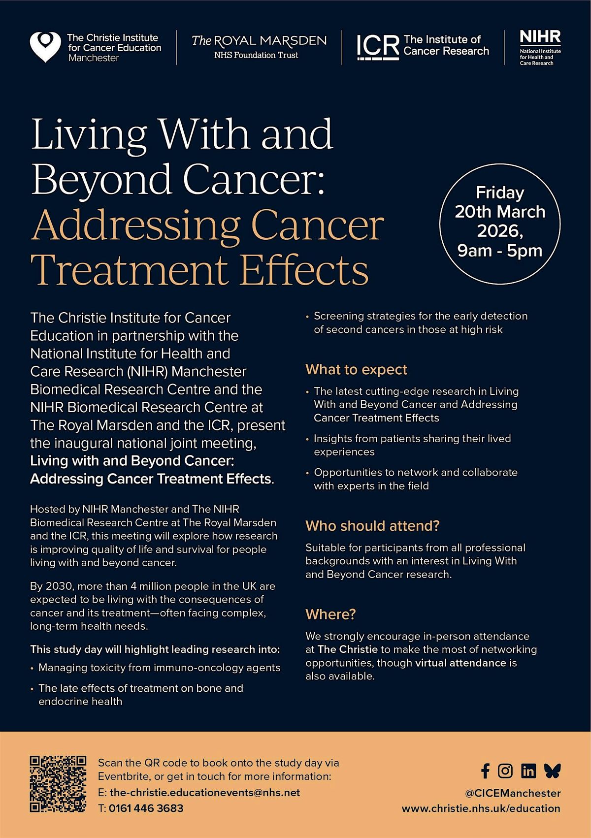 The Christie Institute for Cancer Education in partnership with the National Institute for Health and Care Research (NIHR) Manchester Biomedical Research Centre and the NIHR Biomedical Research Centre at The Royal Marsden and the ICR, present the inaugural national joint meeting, Living with and Beyond Cancer: Addressing Cancer Treatment Effects