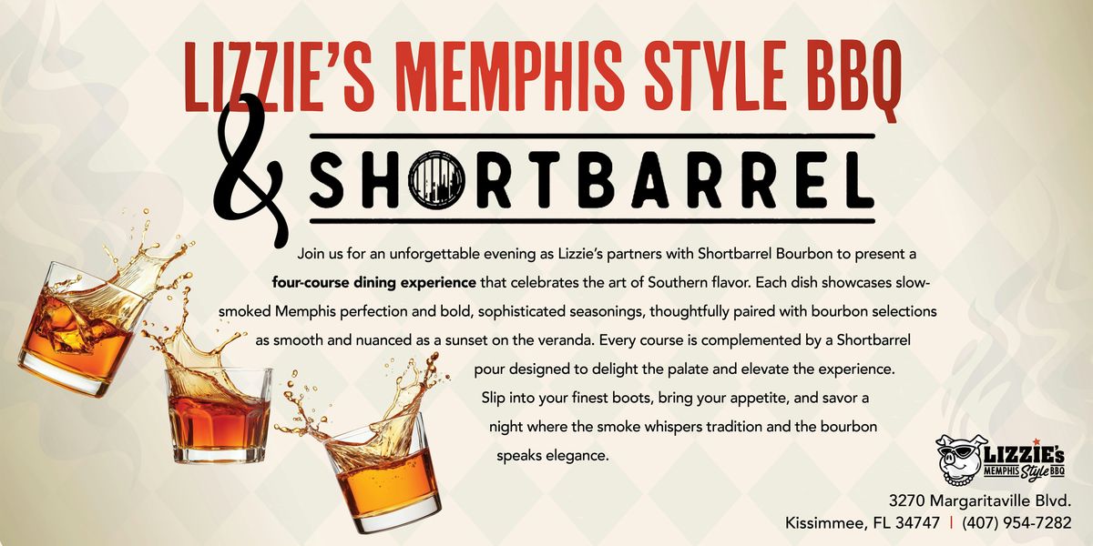 Y'all better come hungry, because Lizzie's is hitchin' up with Shortbarrel Bourbon for a four course paired dinner that's fixin' to turn heads and loosen belts. We're talkin' slow-smoked Memphis magic, bold rubs that don't apologize for a thing, and bourbon pours smoother than a front-porch drawl at sunset. Each course is partnered up with a shortbarrel sip that'll make you say mm-hmm out loud.
