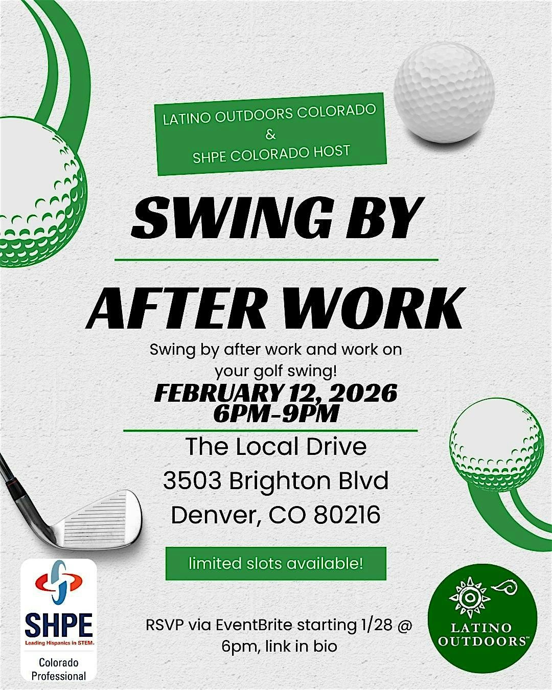 Want to play golf after work, but the early sunsets are interfering? Swing by the Local Drive, a golf simulator lounge in RiNo with Latino Outdoors Colorado and SHPE Colorado. The event is from 6pm-9pm, but feel free to drop in at any time. We'll have two bays reserved for you practice on. Stop by and connect with new and old golf buddies!