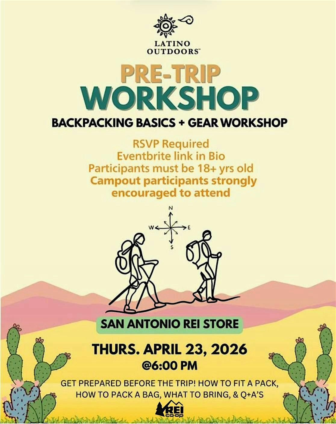 Thinking about joining our upcoming backpacking campout or just want to learn how to get started? Join Latino Outdoors San Antonio for a hands-on workshop focused on everything you need to know about backpacking packs!