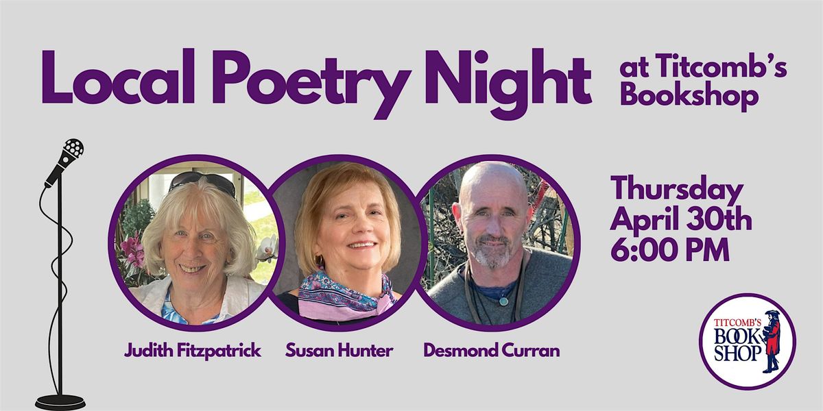 Join us on Thursday, April 30th at 6:00pm to hear poets Susan Hunter, Desmond Curran, and Judith Fitzpatrick read their original works followed by a signing.