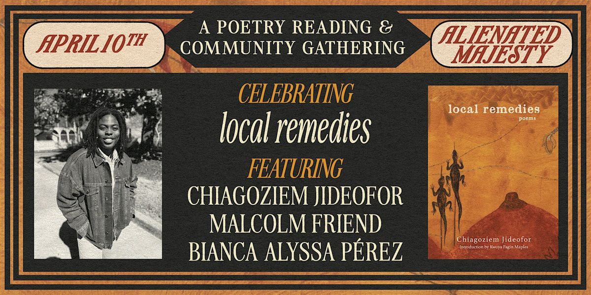 ✦ Host Publications is thrilled to celebrate the launch of Chiagoziem Jideofor's debut poetry collection local remedies! Join us for a celebratory evening featuring poetry readings by Bianca Alyssa Pérez, Malcolm Friend, and Chiagoziem Jideofor; a moderated Q & A session; refreshments, and poetic ecstasy ensue! Hosted by Host Publications editors Annar Veröld-Miranda & Claire Bowman!
