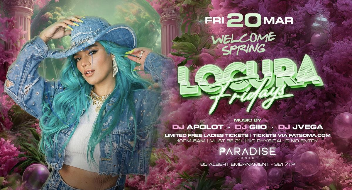 LOCURA FRIDAYS @PARADISE Get ready to party like never before at LOCURA FRIDAYS @PARADISE! Join us EVERY FRIDAY FROM 10PM - 5AM at 65 Albert Embankment, London, SE1 7TP.