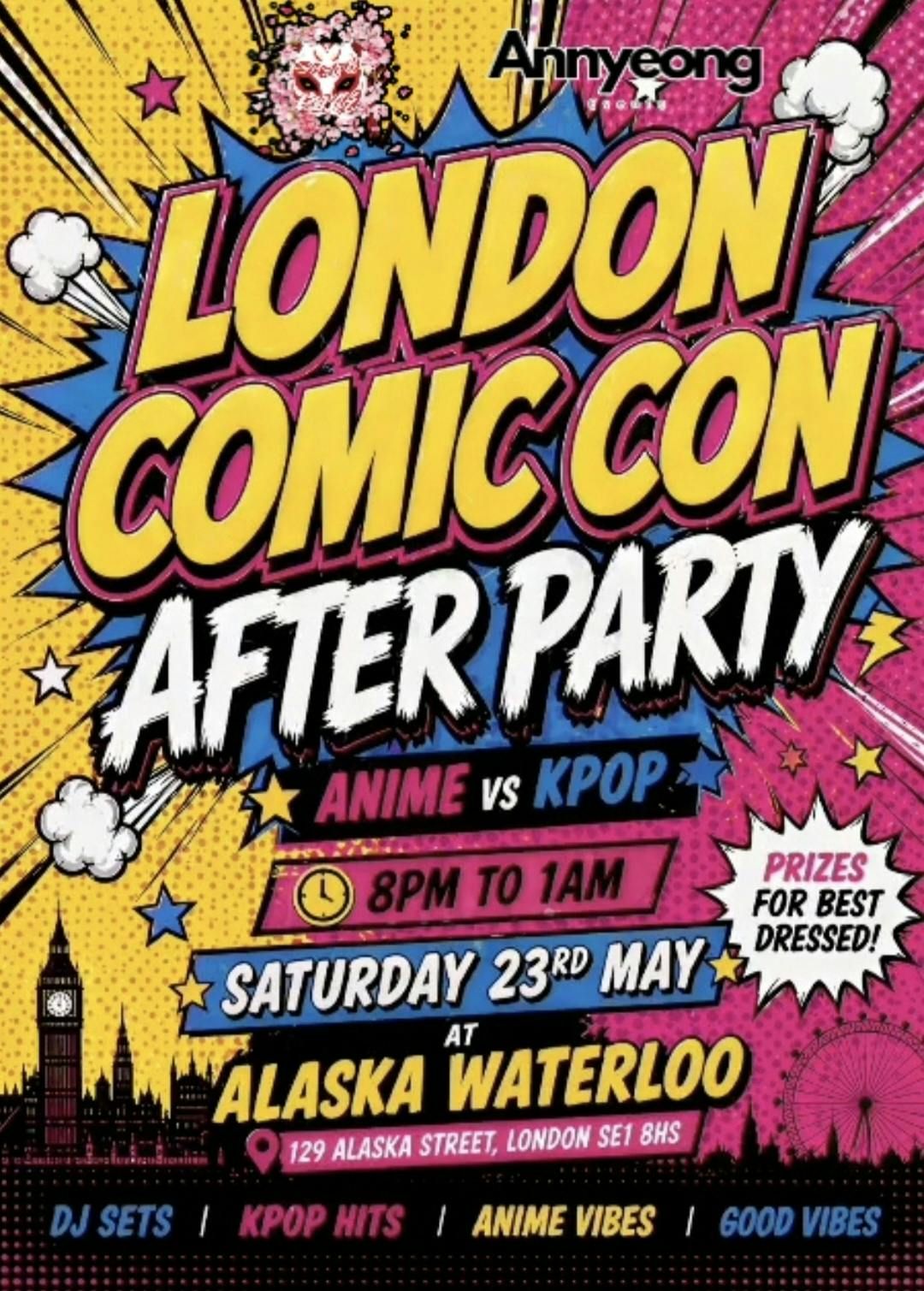 👺LONDON MCM COMIC CON AFTERPARTY: Anime x KPop Rave👺SHIBUYA VICE X ANNYEONG EVENTS | LONDONS BIGGEST ASIAN PARTY | Anime OST JPop JRock KPop KHipHop | 23/5/26What a way to end a Saturday at MCM with the ultimate Anime VS KPop Rave? For this special episode, we at @shibuyavice team up with Annyeong Events and Alaska in Waterloo to bring an event to end the weekend with your favourite OSTs. Playing all the best anime OST as well as JPop, JRock, Vocaloid, KPop and KHipHop, this will cover all your needs to make this the best weekend ever!Coming in your cosplay is urged but not essential. However, there will be a COSPLAY CAT WALK COMPETITION! Those that impress will win a variety of prizes including free drinks!📆DATE📆: SATURDAY 23rd MAY📍VENUE📍 : ALaska Waterloo🕑TIME🕑 : 8pm-1am🎫TICKET & ENTRANCE🎫: From £5. Due to demand, this will be TICKET ONLY▬ ENTRY AND TICKETS .▬▬▬▬▬▬▬▬▬▬▬► £5 Limited Release▬ THE LINEUP: ▬▬▬▬▬▬▬▬▬▬▬▬▬▬▬► Music: Anime vs KPop► 3 DJs▬ THE NIGHT. ▬▬▬▬▬▬▬▬▬▬▬▬▬▬▬► Saturday 23rd May► Event Time: 8pm onwards► Venue: Alaska► Club Photography will be taken throughout the nightFollow, and Join our pages and groups to be the first to keep updates about events and news over the next year.► Follow our page to keep updated on future events and club photos: Empire Project: https://www.facebook.com/Empir...