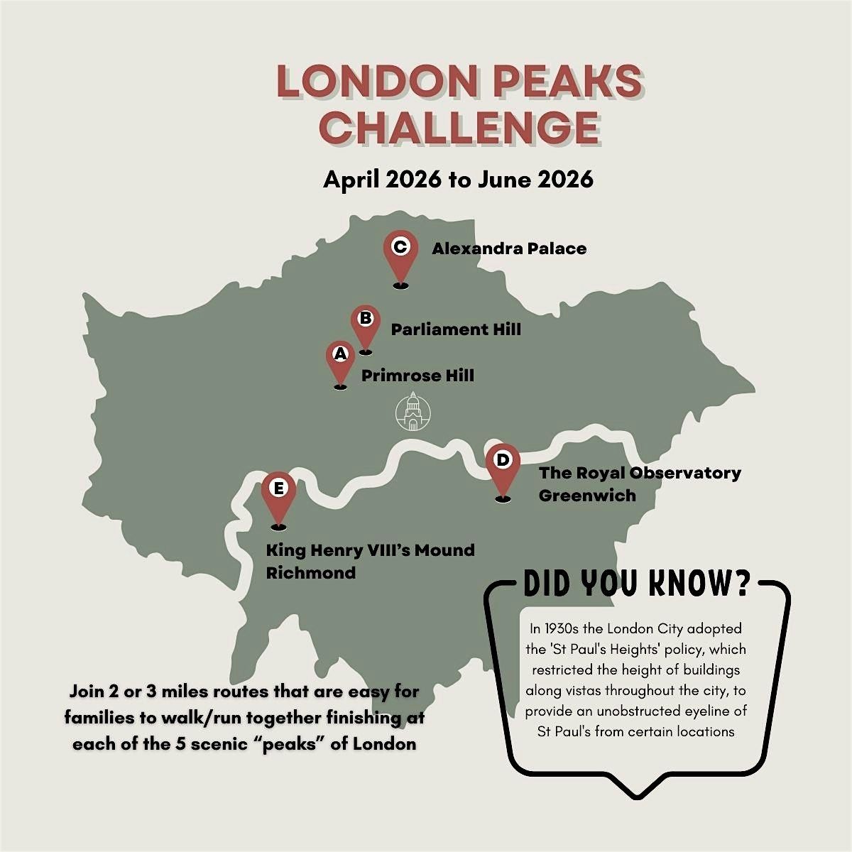 London Peaks Challenge is a family-friendly event running across five weekends to hike to five iconic high points in London from where you can see spectacular views of St Pauls Cathedral and the city.