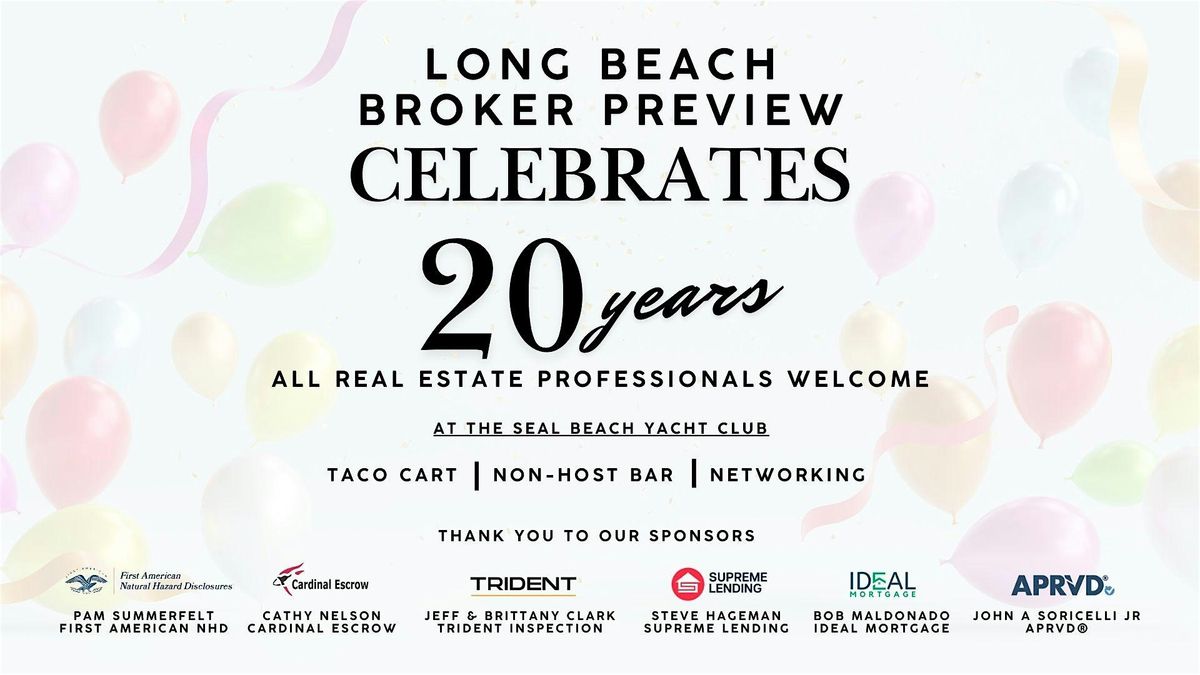 Join Long Beach's largest networking group of real estate professionals for our 20th anniversary party. Come have a toast and tacos and enjoy a great time. (Hosted taco cart, Non-host bar). All real estate professionals welcome. See You There!