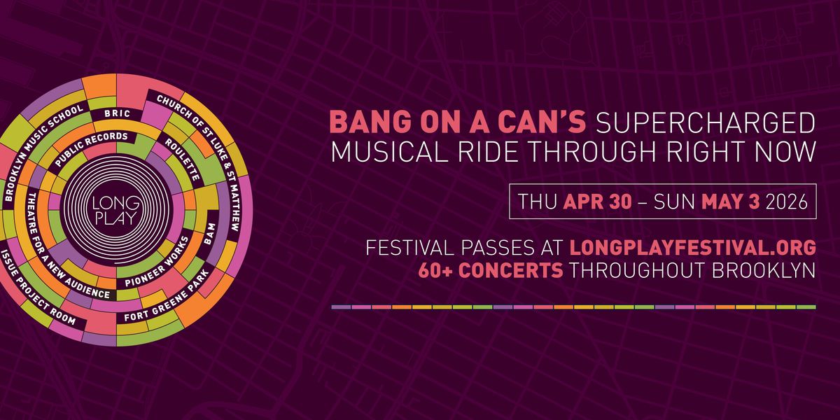 Bang on a Can presents the 5th year of Long Play, a destination music festival, presented from Thursday, April 30th through Sunday, May 3, 2026. Featuring 70+ concerts, Long Play also showcases a dense network of inventive music venues in Brooklyn – with performances at BRIC, BAM (Brooklyn Academy of Music), Brooklyn Music School, Roulette, Pioneer Works, Public Records, the Church of St Luke and St Matthew, ISSUE Project Room, Polonsky Shakespeare Center for Theatre for a New Audience, and Fort Greene Park – and more!