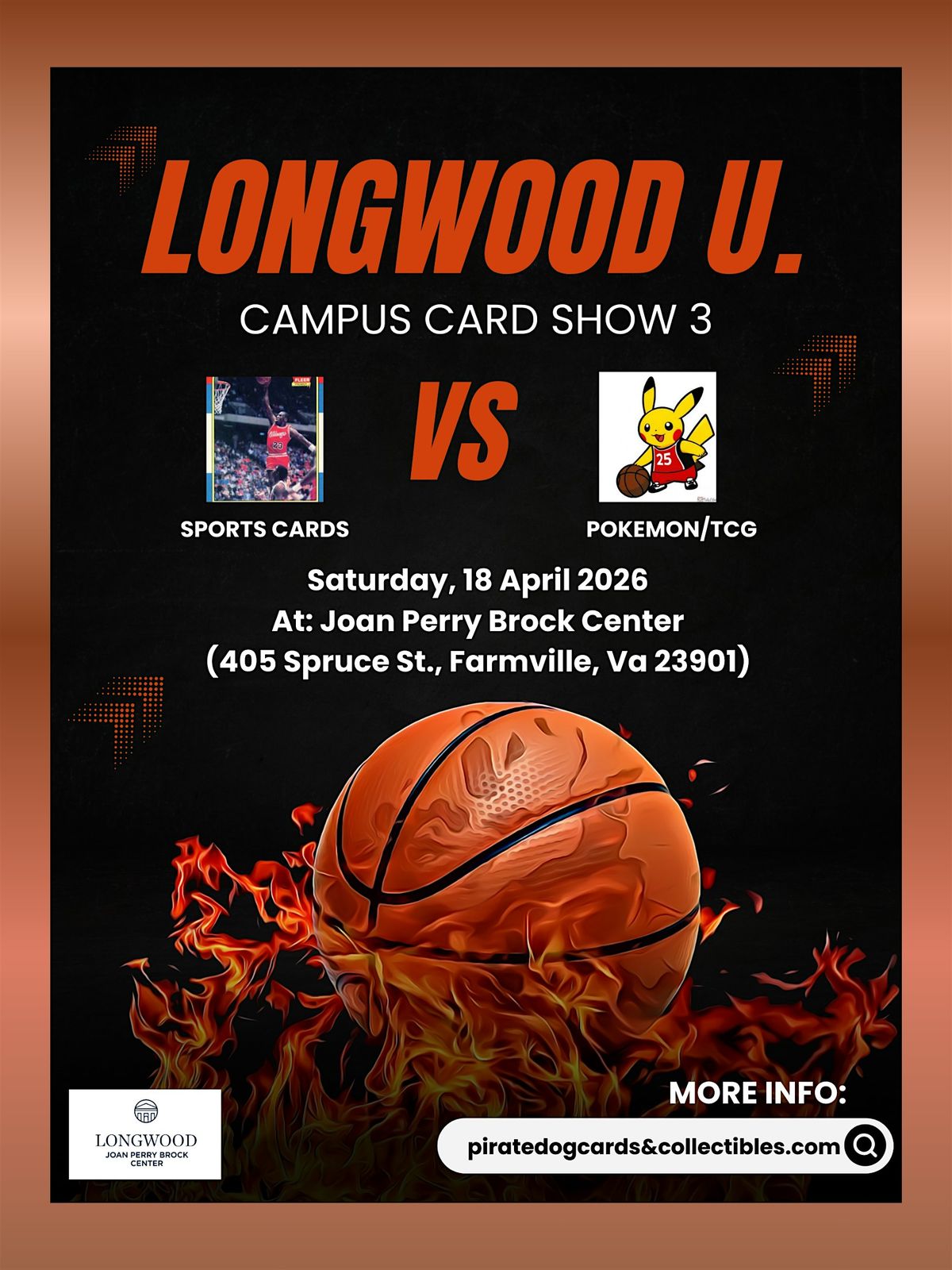 Join the local community and come out to the Longwood University hosted Pirate Dog Cards & Collectibles Show! We return with another event this time at the Joan Perry Brock Center in Farmville Va for an amazing show on Sunday, April 18thfrom 10:00 AM to 5:00 PM! Whether you're a seasoned collector or just starting out, this event is perfect for all enthusiasts. Browse through a wide selection of Modern and vintage cards, TCG including Pokemon and One Piece, Tobacco Cards, sealed Wax Packs and boxes, hobby supplies and more! Meet fellow collectors, make a trade or two at our dedicated traders table and maybe even find that rare treasure you've been searching for. Hourly door prizes, full concessions and DJ Eddo Face will set the tone and vibe for this Campus Wide Party/Event! Admission will be FREE to the general public with students and staff also admitted for free! I am Happy to be bringing PDCC Shows west through Virginia! I hope to see everyone there!