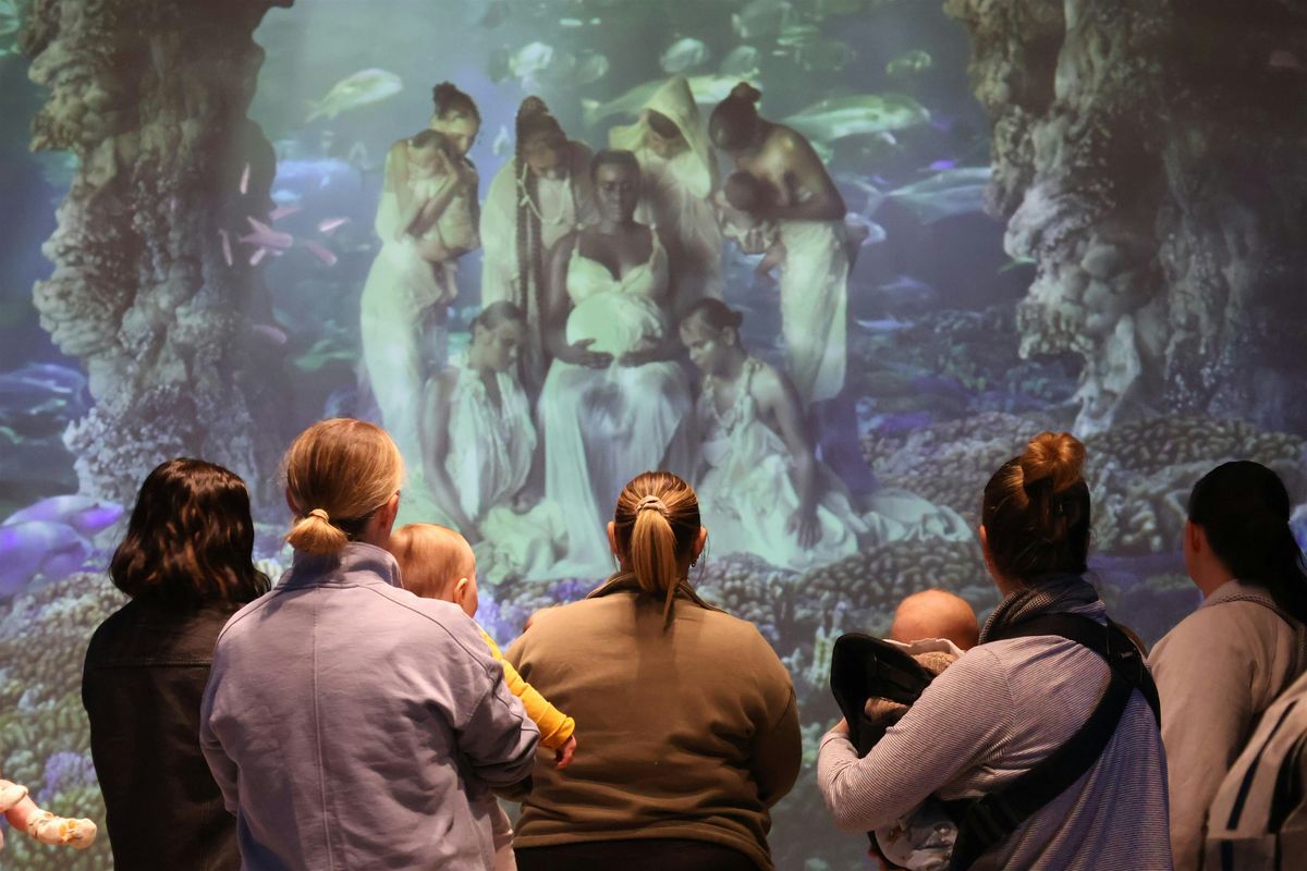 Image credit: Parents and children participating in 'Look Baby'. Installation image ‘Moving’ featuring Hannah Brontë, ’EYE HEAR U MAGIK’ 2020, (still), single channel video, colour, sound, 7:36min, courtesy the artist. Photograph by Goulburn Regional Art Gallery.
