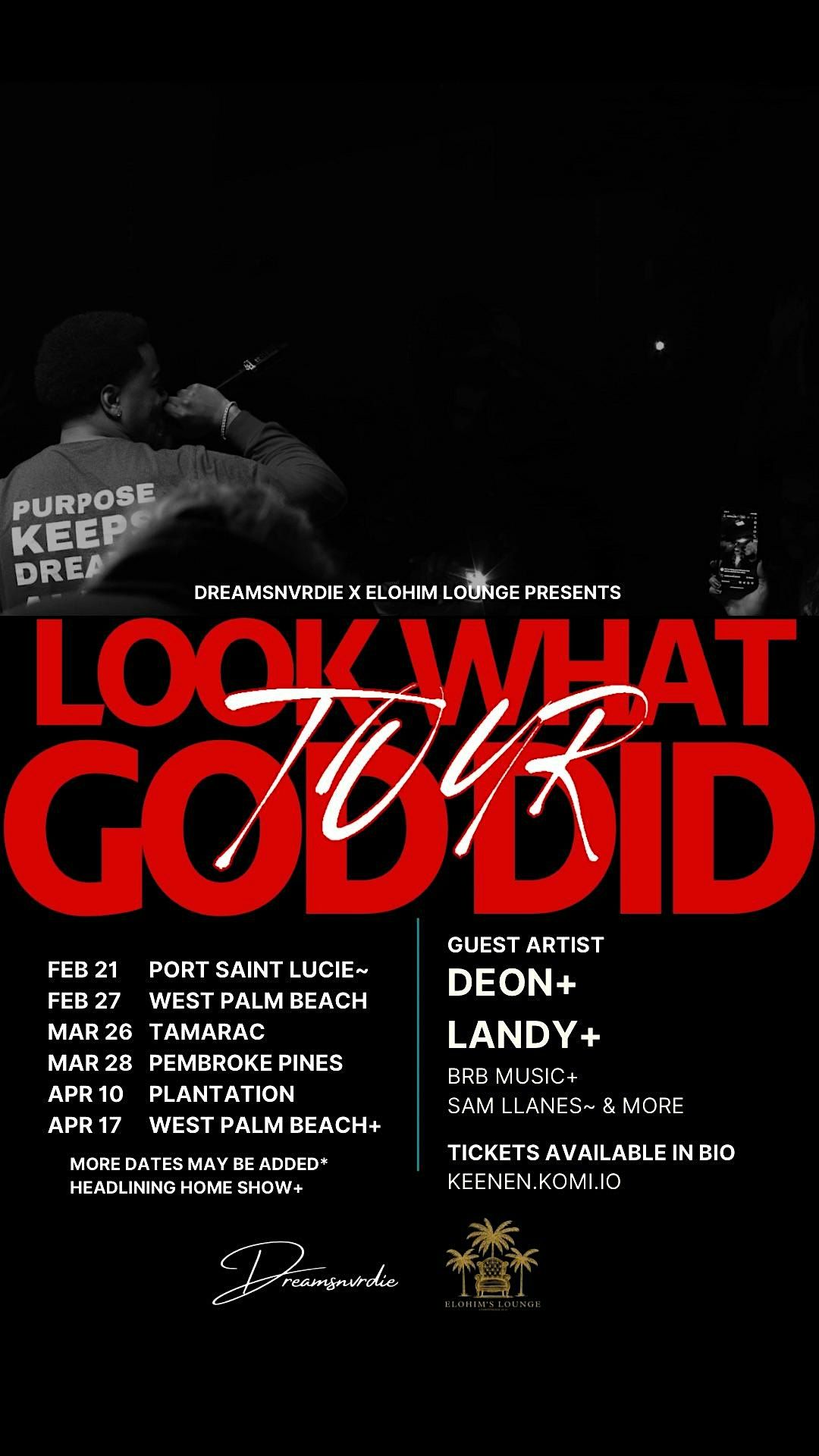 Get ready for an unforgettable night at The Diplomat Center of the Palm Beaches! Join us on April 17, 2026 at 7:00 PM (Eastern Time) for an incredible concert featuring top artists KEENEN, DEON. LANDY, BRB MUSIC & MORE. Don't miss out on this opportunity to experience amazing performances and create lasting memories with friends and family. Mark your calendars and get ready to be amazed by the move of God.