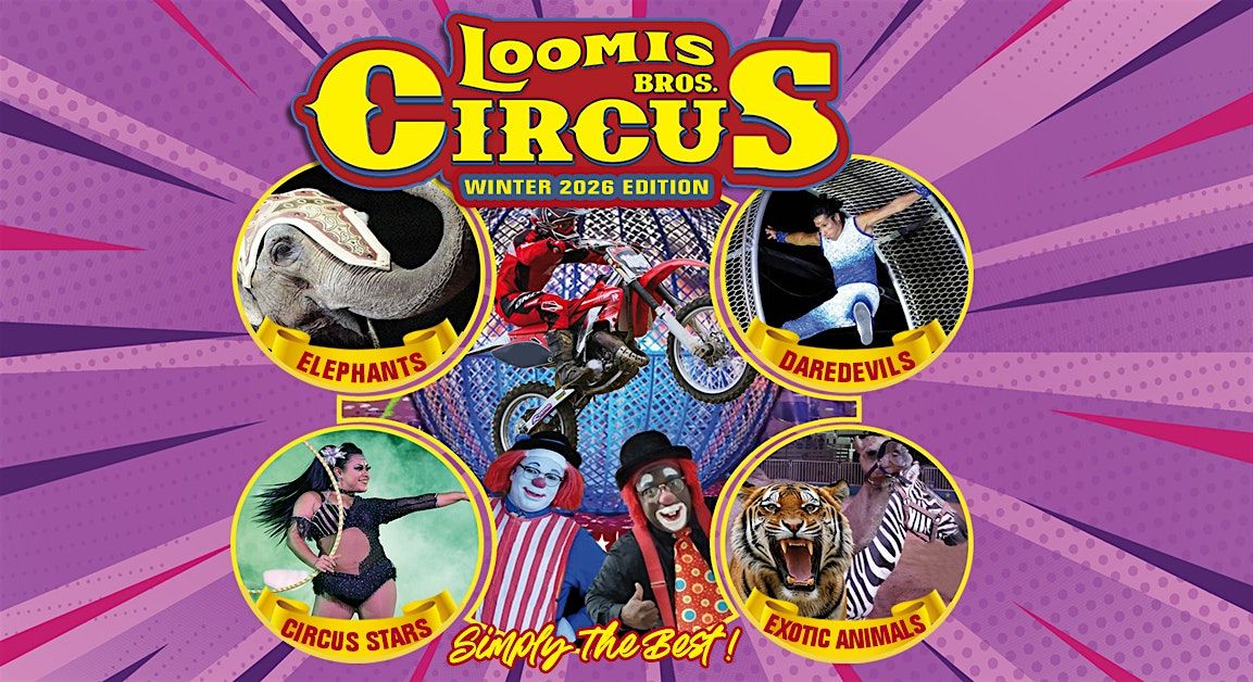 Get ready for three-rings of family entertainment when the award-winning Loomis Bros. Circus brings the new 2026 Edition of their award-winning circus to your town! Discover a captivating blend of classic circus charm and modern circus thrills, showcasing majestic animals displaying their amazing abilities, fearless daredevils that will have you on the edge of your seat, high-flying acrobats defying gravity, outlandish clowns and much more...all backed by the beats of a live band.