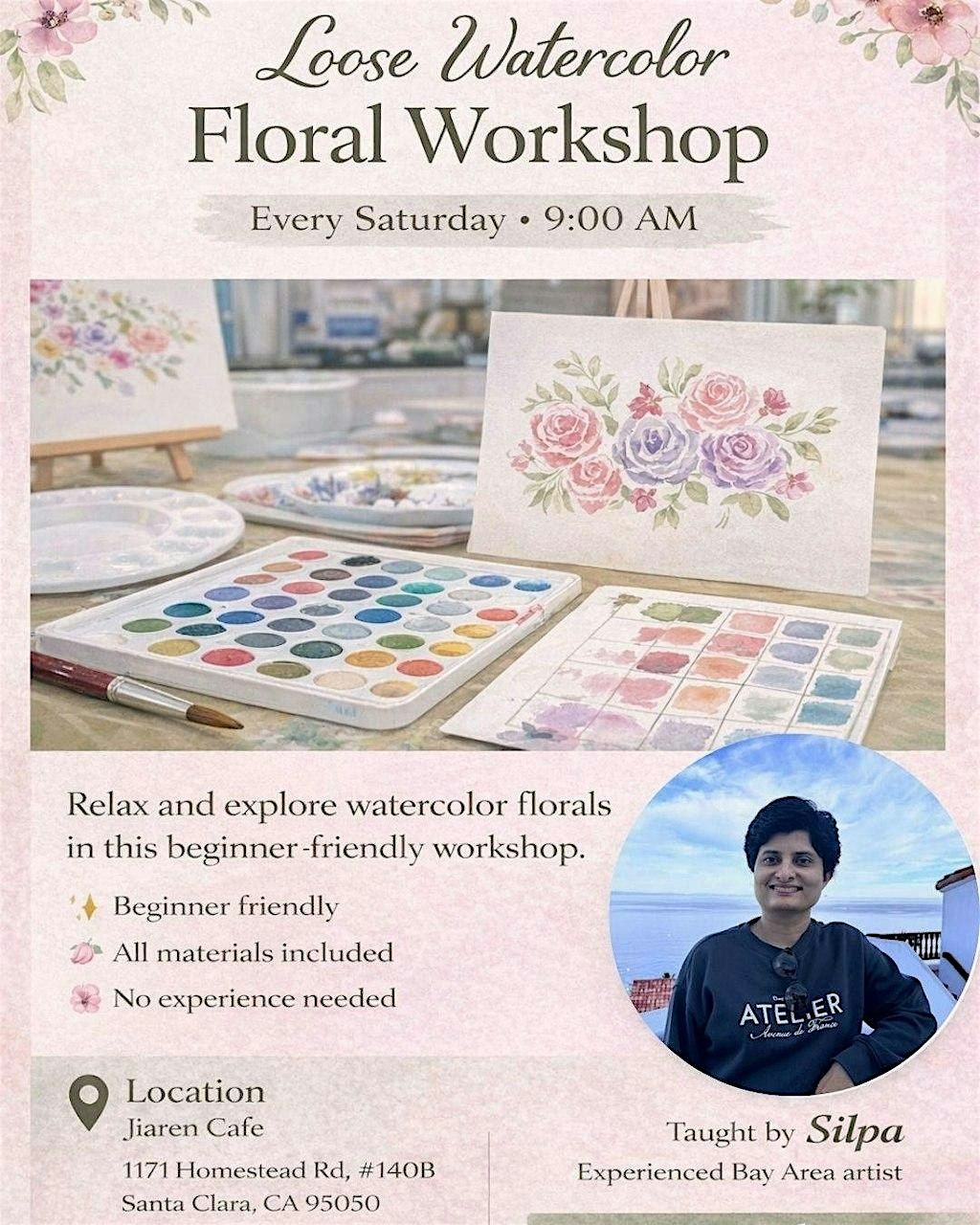 Loose Watercolor Floral workshop is lead by Bay Area artist Silpa. Through workshops and art classes Silpa shares her passion for painting. Her paintings adorns the walls of Bay Area homes, and have also been exhibited in different museums and art shows. She loves exploring different painting styles and mediums, and through her work she explores her love of nature.