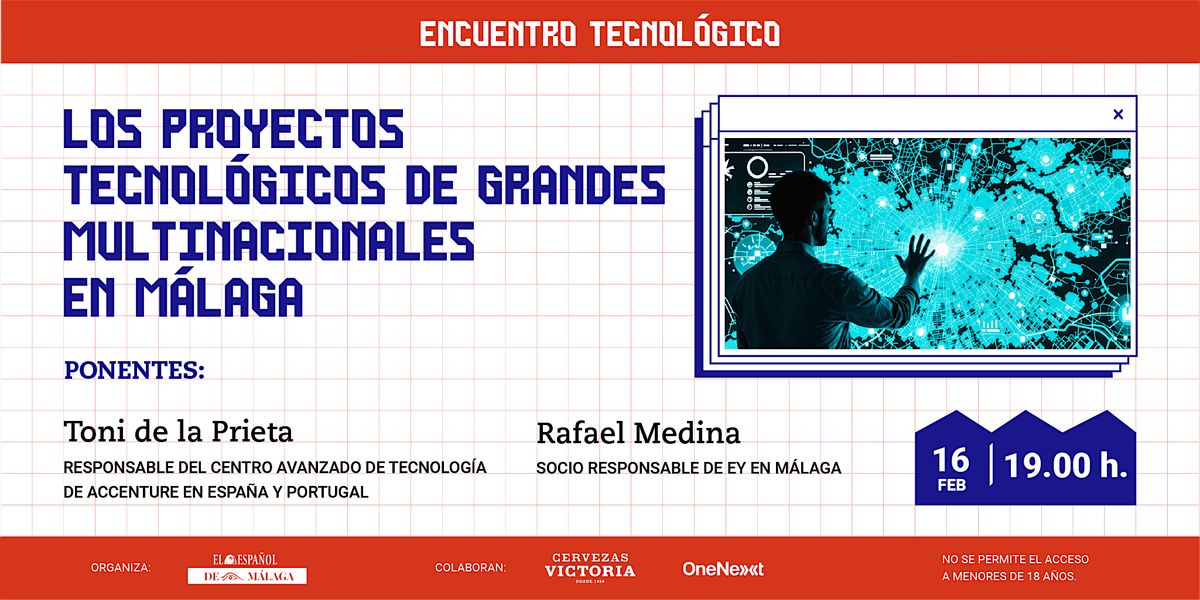 ¿Quieres conocer en qué proyectos tecnológicos están trabajando dos grandes multinacionales en Málaga como Accenture y EY? EL ESPAÑOL de Málaga te da la oportunidad de saberlo en su XXXIX Encuentro Tecnológico que tendrá lugar el lunes 16 de febrero a las 19:00 en Cervezas Victoria.