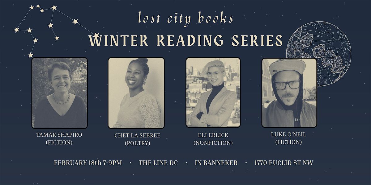 Lost City Books + The Line DC welcome you to attend our Winter Reading Series, the latest installment of a quarterly series where we invite talented authors doing exciting work in all different genres to join us and read aloud a piece of their choosing. We'll eat, drink, talk, and listen, meet fellow lovers of literature, discover new authors, and mark the changing of the seasons together.