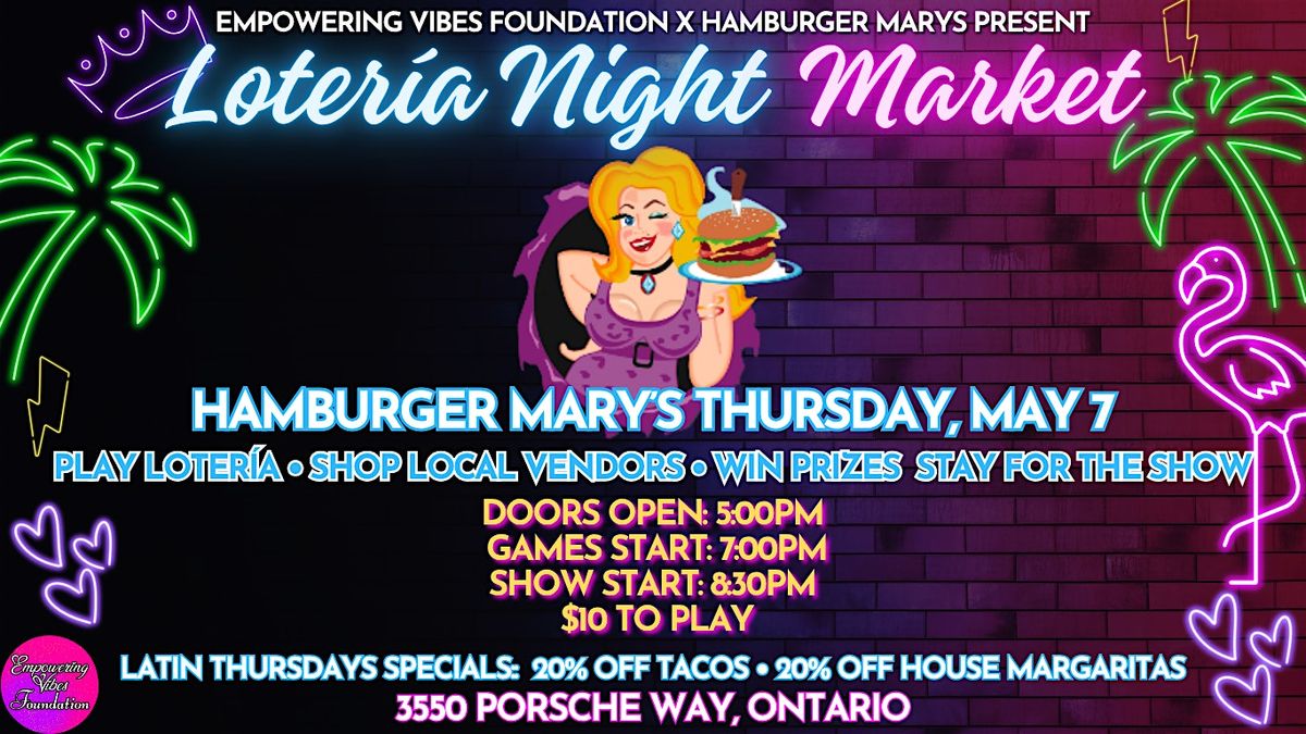 Join us for an unforgettable Thursday night at Hamburger Mary's Ontario where Lotería, local vendors, delicious food, and live entertainment come together for the ultimate night out in Ontario, California.