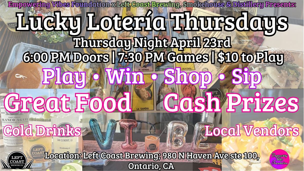 Loter\u00eda Thursdays at Left Coast Brewing | Games, Cash Prizes & Local Play Lotería, win cash prizes, shop local vendors, and enjoy food and drinks at Left Coast Brewing in Ontario. 2nd & 4th Thursdays!!