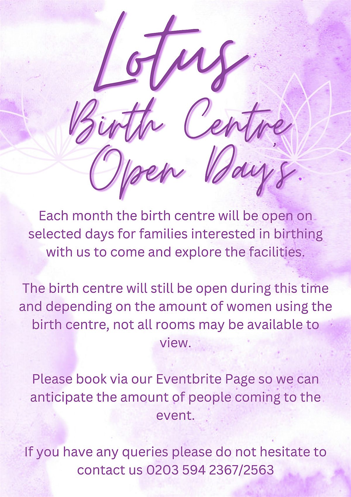 Please book via our Eventbrite Page so we can anticipate the amount of people coming to the event. Please only book one ticket per couple. Your ticket is for yourself and one birth partner. Additional tickets will be cancelled. Please do not bring additional birth partners or children with you to the open day. This is to ensure privacy for those who may be using the birth centre during the tour.