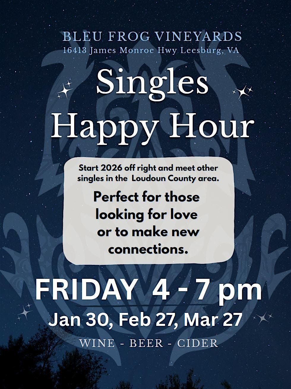 Come join us for a fun evening at Bleu Frog Vineyards & Ole Bleu Brewery to mingle with other singles in the area. Let's enjoy great drinks, good company, and maybe even make a romantic connection!