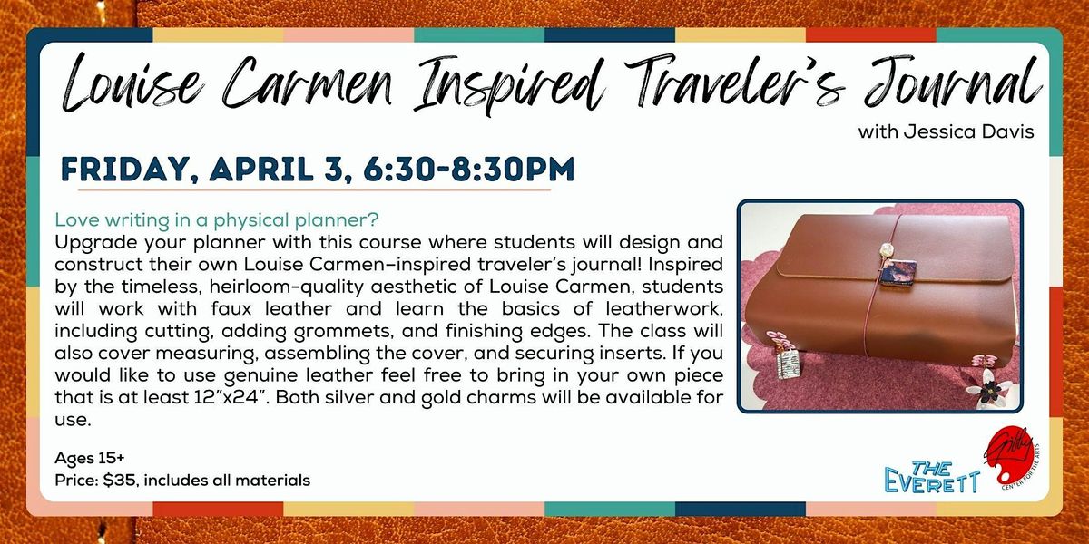 Love writing in a physical planner? Upgrade your planner with this course where students will design and construct their own Louise Carmen–inspired traveler’s journal! Inspired by the timeless, heirloom-quality aesthetic of Louise Carmen, students will work with faux leather and learn the basics of leatherwork, including cutting, adding grommets, and finishing edges. The class will also cover measuring, assembling the cover, and securing inserts. If you would like to use genuine leather feel free to bring in your own piece that is at least 12”x24”. Both silver and gold charms will be available for use.