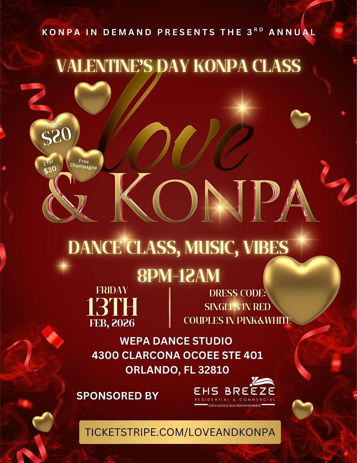 Join us for a night of excitement at our Love&Konpa Class! Sip on free fine wine & champagne, mix and mingle with new people and dance to Konpa and RNB. Whether you're flying solo or coupled up, singles wearing red, while couples wear pink and white. Engage in dating games and learn some new moves that promise laughter and connection. Don't miss this chance to mingle, dance, and potentially find your perfect match!