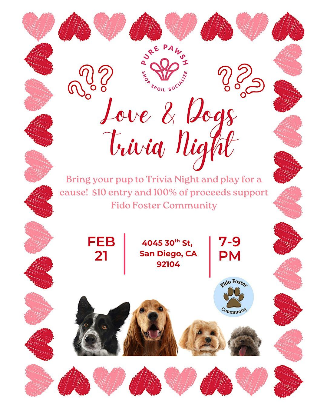 Join us at Pure Pawsh for Love & Dogs Trivia Night on February 21st from 7:00-9:00 p.m.
