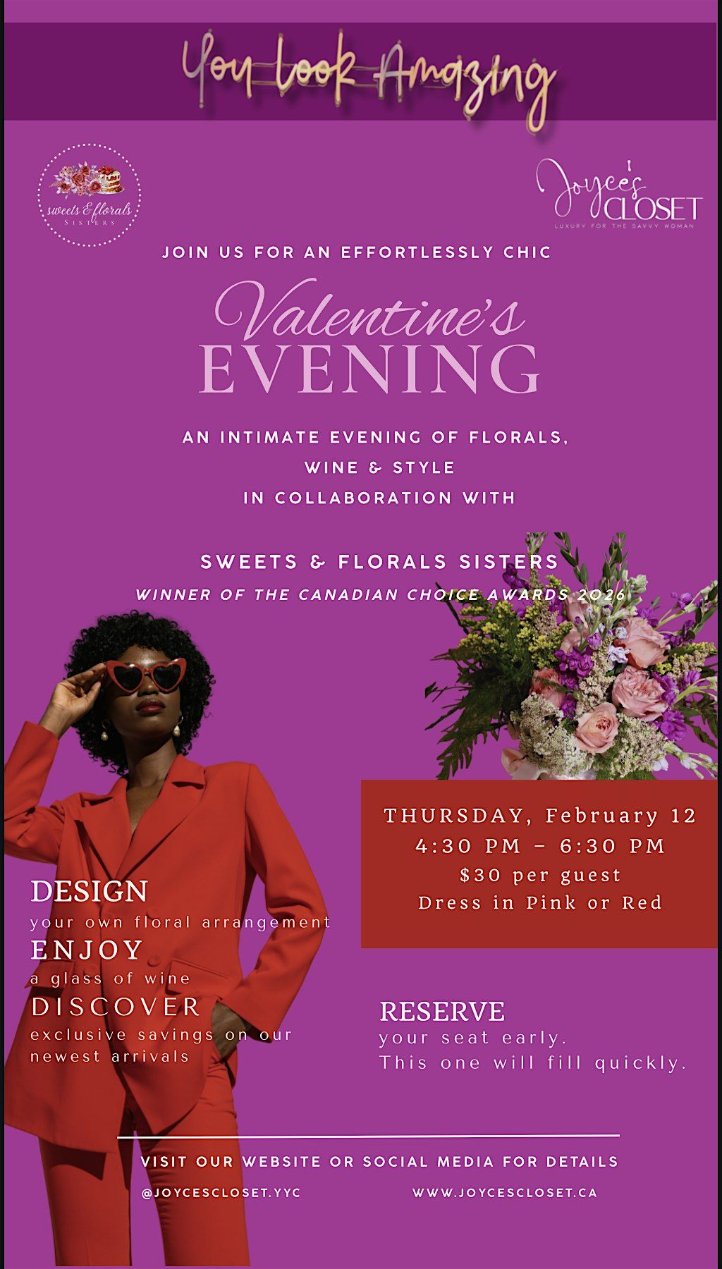 Join us for a chic and creative Valentine’s evening at Joyce’s Closet, hosted in collaboration with @sweetsfloralsisters.