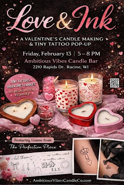 Join us for a Valentine’s themed pop-up experience at Ambitious Vibes Candle Bar featuring a Tiny Tattoo Pop-Up with Lianne from The Perfection Place.