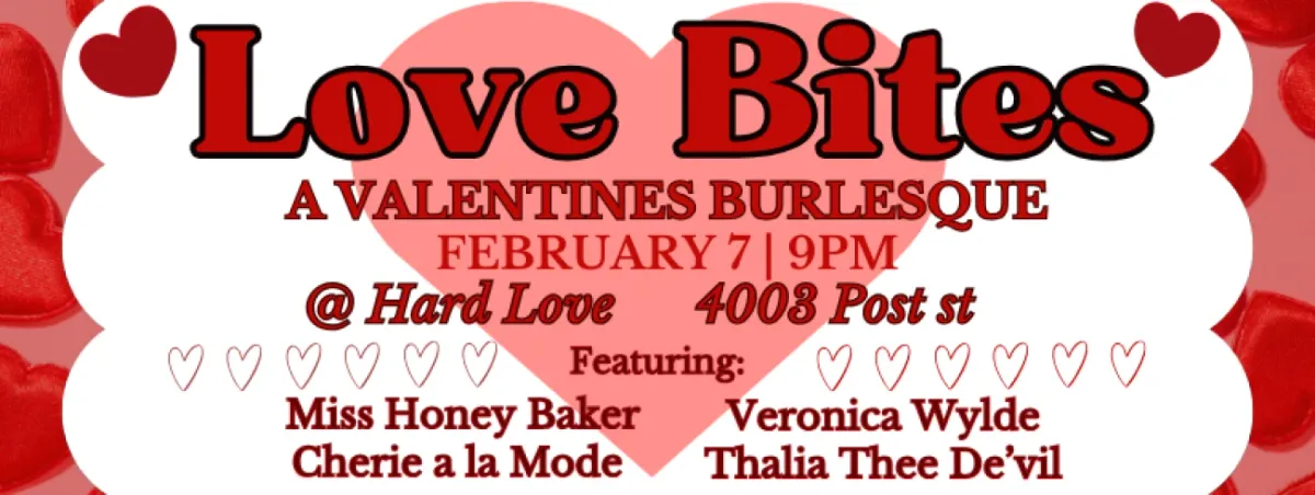❤️🔥 Love Bites a Valentines Burlesque at Hard Love ❤️🔥Saturday, February 7th9 pm 4003 Post St18+This Valentine’s Day, trade candlelit clichés for something louder, sexier, and far more fun.Expect a lineup of dazzling performers serving classic striptease, bombastic burlesque, and jaw-dropping acts set to thumping music and dripping with sass. From slow burns to high-energy numbers, every performance is designed to make you laugh, blush, and cheer for them titties. Whether you’re bringing a date, a partner, your best friends, or just yourself, this is a night for lovers of spectacle and unapologetic desire. Grab a drink, claim your spot, and let the music, the tease, and the heat of the room pull you into a Valentine’s night at the Rose Room (Hard Love) you won’t forget.