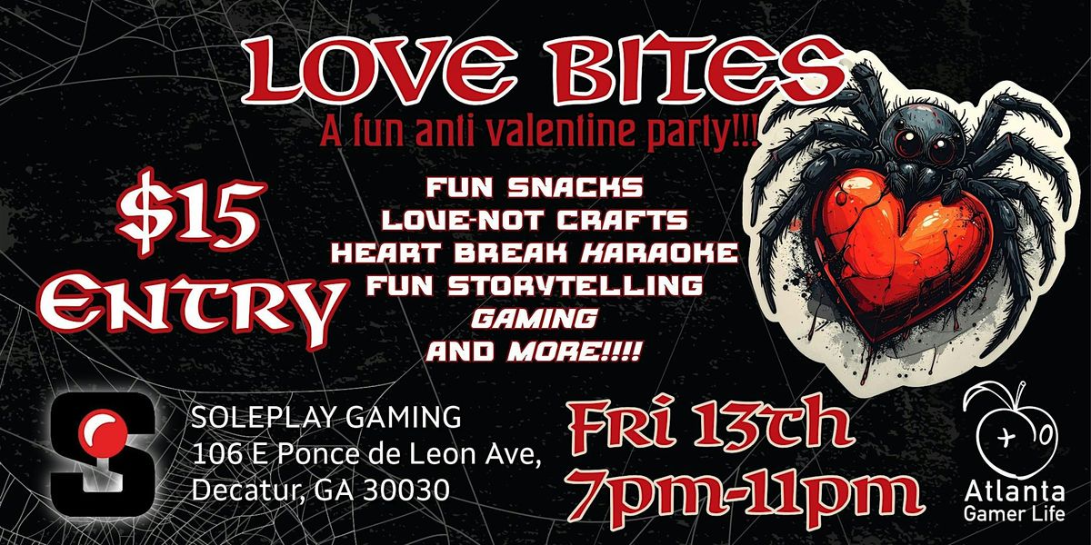 Join us for fun snacks, love-not crafts, heart break karaoke, fun story-telling, gaming and more at Soleplay Gaming Decatur! By Kimmiko