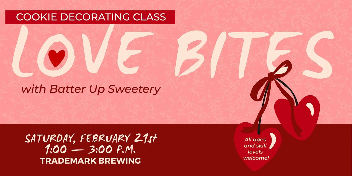 Join local cookie artist Alenni Chitwood of Batter Up Sweetery for a hands-on Love Bites Cookie Decorating Classat Trademark Brewing on Saturday, February 21 from 1–3 PM.
