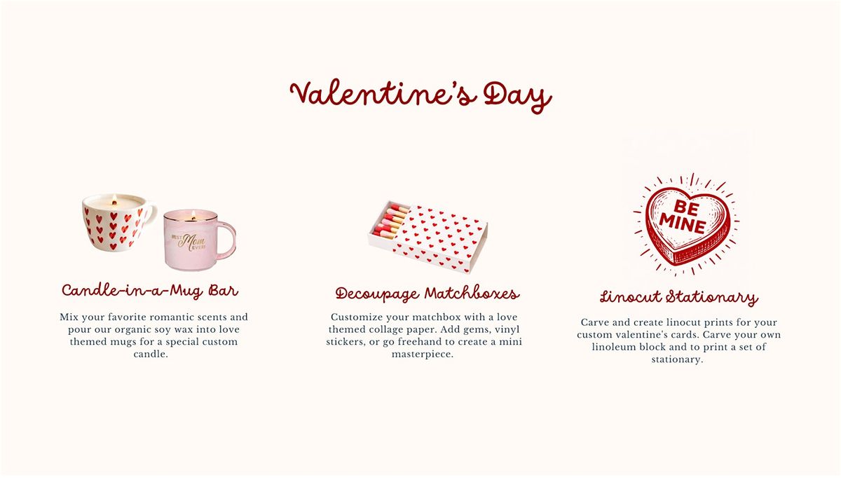 Guests can rotate through three Valentine’s Day–themed craft stations—candle-making, decoupage matchboxes, and linecut stationery for creating your own handmade Valentine—each guided by Arts Club Studio artists.