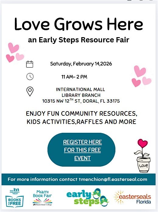 Love Grows Here! Join us for a fun-filled FREE Family Resource Event on Saturday, February 14, 2026, from 11AM–2PM at Doral Regional Library (10315 NW 12TH STREET MIAMI, FL 33172). Enjoy kids activities, community resources, and more - plus a food truck with tasty eats available for purchase!